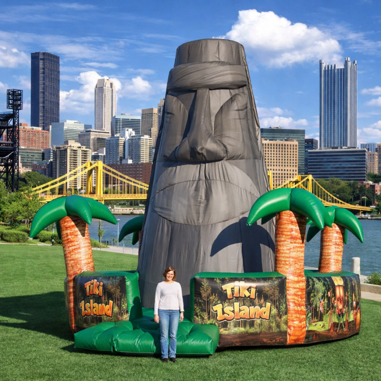 The Tiki Island theme gives this attraction a tropical, high-impact look, while the climbing challenge creates the kind of experience people notice from across the event. It is the kind of rental that draws a crowd, gets photographed, and gives guests a reason to line up and take on the climb.